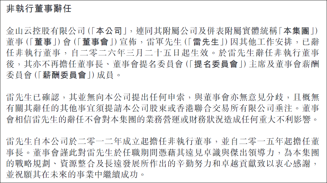 3月25日晚间,金山云发布公告称,雷军因其他责任安排,已辞任董事长、非实行董事、董事会提名委员会主席及董事会薪酬委员会成员,自2026年3月25日起见效。