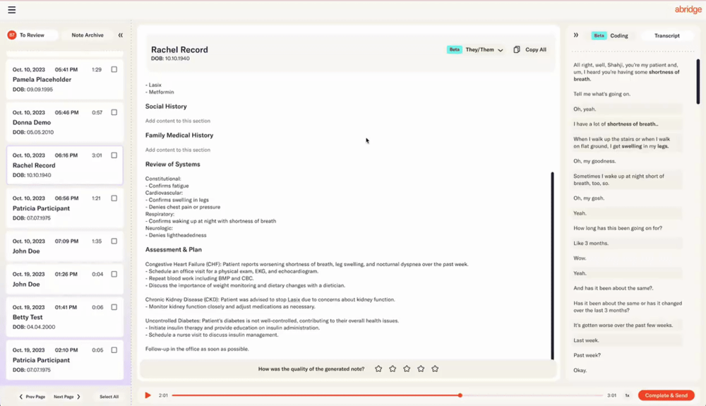 在好意思国,看诊 1 小时,写病历 2 小时。许多医师放工后还要在家补条记,这段时候被叫作念“寝衣时候”。Abridge 作念的事,即是把这 2 小时还给医师,医师和患者聊完天,几秒钟自动生成一份结构化病历条记。