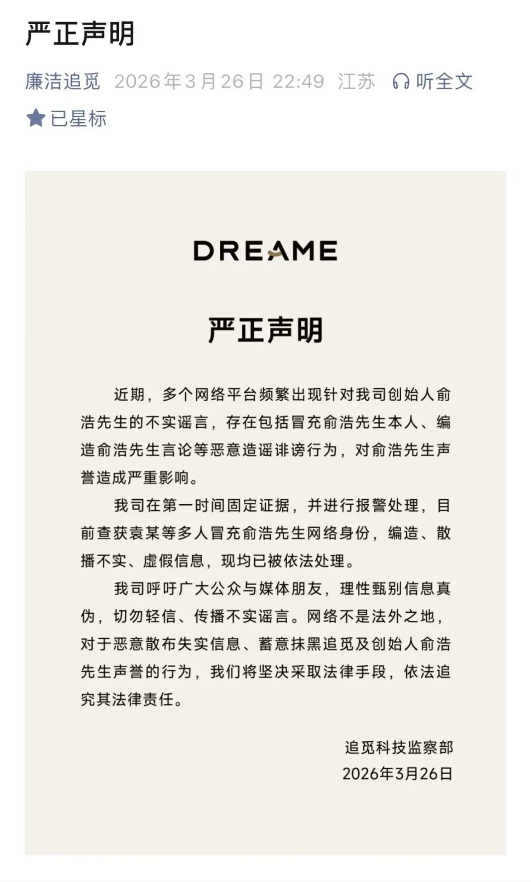 追觅科技默示,公司在第一时刻固定把柄,并进行报警管束,当今查获袁某等多东谈主冒充俞浩先生收罗身份,假造、分布不实、演叨信息,现均已被照章管束。