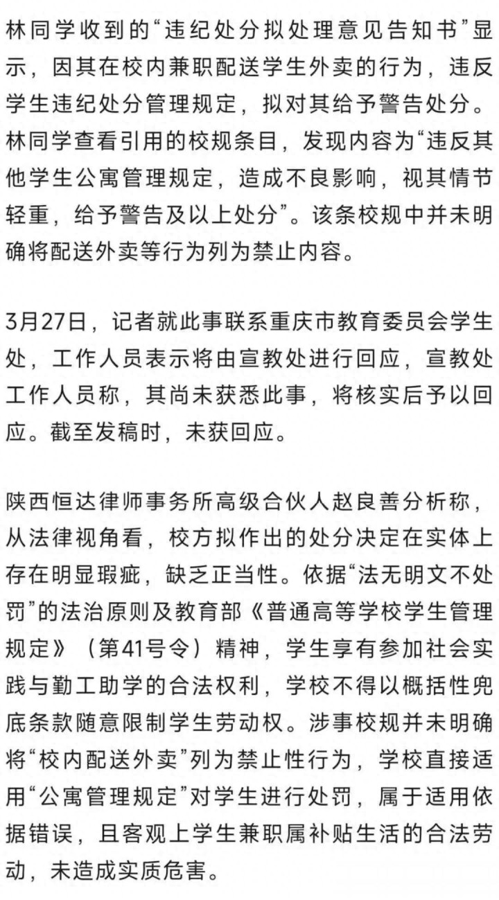 重庆某管事学院的大一学生小林,从前年一月起就在学校里送外卖,他不是为了好玩,是因为家里条目不太好,思挣些生活费来用,第一次被学校发现后,让他写了保文凭,最近又被查到,学校成功发了违规刑事拖累奉告书,这事传开以后,各人才知谈,光是他们学校就有十几个学生在作念这个,大部分皆是因为经济上有艰难。
